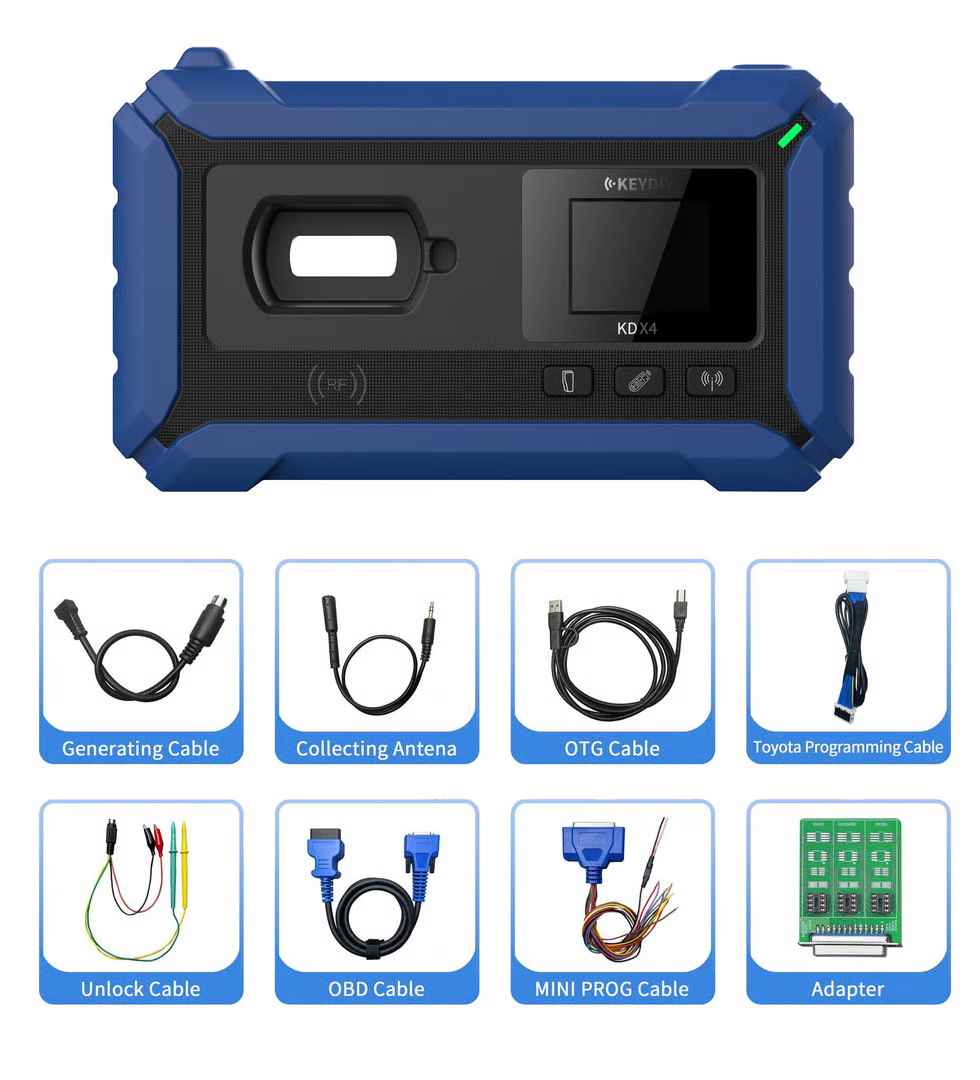 The KEYDIY KD-X4 box contains the KD-X4 device, OBD main cable, USB cable, Toyota adapter cable, programmer adapter board, programmer wiring cable, remote control burning cable, key unlocking cable, and an external acquisition antenna.